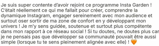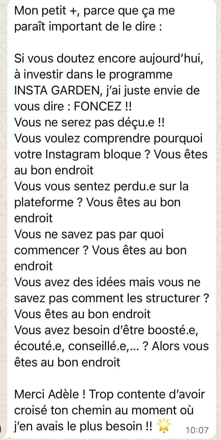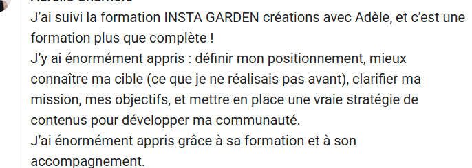 En rejoignant INSTA GARDEN, tu apprends à mettre en place un système que j'utilise et que j'enseigne à mes client(e)s ↓